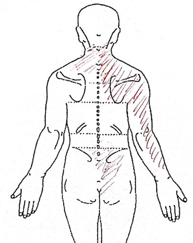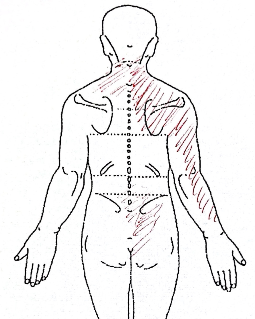 右腕を前や後ろに上げようとすると痛くて挙げられず、背中も張って呼吸するのも苦しかったそうです。